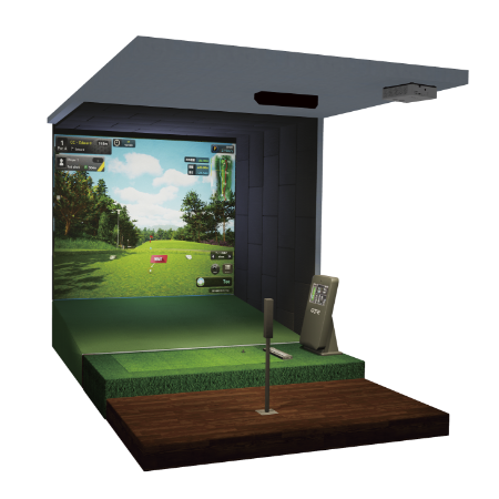 ゴルフナビが提供するインドアゴルフ設備は、高性能ゴルフシミュレーター・専用オートティーアップ機・専用スイングプレート・ボール回収傾斜板(特許出願中)・打球スクリーンを完備。